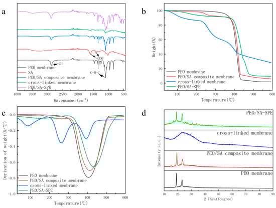 (a) FTIR; (b) TGA; (c) DTG; (d) XRD curves of PEO membranes, PEO/SA composite membranes, cross-linked membranes, and PEO/SA-SPE.