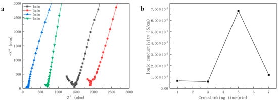 EIS (a); and ion conductivity (b) of electrolytes at different crosslinking time.