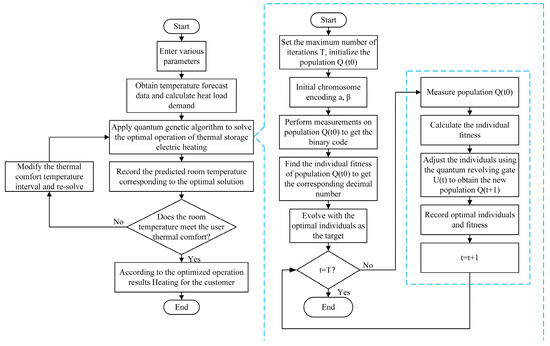 It is a nonlinear planning problem to develop a regenerative electric heating optimal regulation strategy that takes into account the differences in the thermal comfort of the users. An algorithm is used to solve the dynamic optimal regulation model developed in this section. Combined with the model built in this chapter, the fitness function is a nonlinear function of optimal comfort or optimal economy directed by the differential preference factor under the influence of preference regulation control coefficients. Quantum bits and quantum logic gates are used to update the chromosome to encode and update the operating state of the direct heat equipment. The solution flow of the dynamic optimal regulation strategy based on QGA is shown in Figure 2, and the specific solution method is as follows: