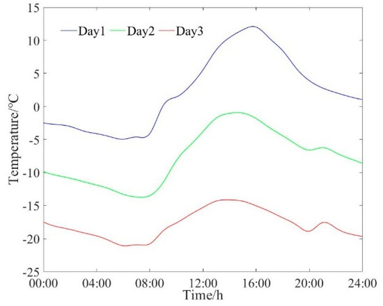 In this section, we analyze an example of the “coal to electricity” conversion project being performed in a rural area of a city in the Liaoning Province of China. The average building area of the town is 82 m2 and the rated power of regenerative electric heating is , taking into account the heat load demand of and the heat storage time of per day with a certain margin. The typical daily outdoor temperature data used in this example is the result of the fuzzy C-mean algorithm clustering of the data sampled from the weather observatory near the town from 1 November 2022 to 1 April 2023, as shown in Figure 3. The user set temperature is the thermal comfort temperature interval for each type of user in Table 6. is taken as 0.25, and are taken as 0.5 when calculating the comfort index, and is taken as 0.4 in the optimization objective expression. The other main equipment parameters are: