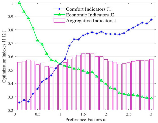 The response of each optimization index solved by the QGA to the preference factor is shown in Figure 5. The graphs show that the results are in accordance with the predefined preference factor : the larger the the more users prefer good heating experience, and the smaller the the more users prefer good economy at the expense of a certain heating experience. The corresponding preference factor can be obtained in Figure 5 according to the comfort and economy preference coefficients for the five groups classified in Table 3, which provide parameters to support the subsequent calculation. The preference factor for the high-income youth group, middle-income youth group, low-income youth group, middle-income elderly group, and low-income elderly group are 2.7, 1.3, 0.5, 1.8, and 1.0, respectively.