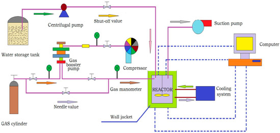 The schematic diagram of the experimental apparatus was consistent with that of the previous study [16]. As shown in Figure 1, the experimental apparatus included an air intake system, a liquid intake system, a data acquisition system, a cooling system, and a hydrate reactor. The CO2 gas was supplied by opening the needle valve of the gas cylinder, which could withstand being placed in the reactor up to 30 MPa. A viewing window was equipped to observe the morphology of hydrate formation. A thermocouple (Pt100) and a BD pressure transducer were used to measure the temperature and pressure in the reactor. The reactor (500 mL) was placed in the water bath, for which the temperature was controlled by a chiller provided by Ningbo Tianyu Instrument Factory, in Ningbo, China. A magnetic stirrer was opened to better mix the gas–liquid. The pressure and temperature during the hydrate formation were recorded in real time.
