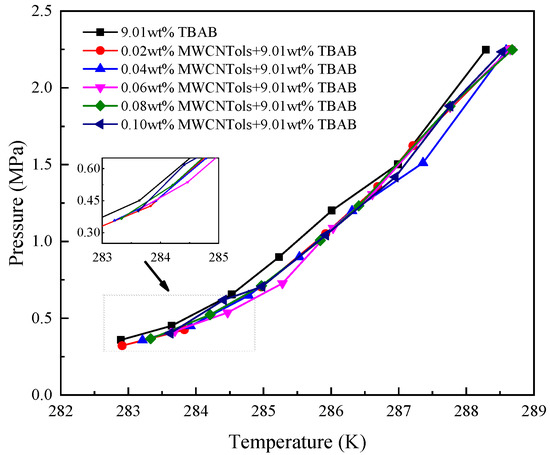 It is noted that the CO2 hydrate formation conditions in the presence of GNs had been reported in the literature [16,42]. Therefore, in this work, the determination of the CO2 hydrate formation conditions was focused on the system containing MWCNTols. Figure 2 shows the phase equilibrium curves of CO2 hydrate formation in the suspension with different concentrations of MWCNTols, and the specific data are displayed in Table 1. As seen in Figure 2, it can be found that the addition of MWCNTols slightly decreased the CO2 hydrate formation phase equilibrium conditions compared to those of the 9.01% TBAB single system. The results were different from those obtained by Zhou et al. [16]. In the system containing TBAB and GNs, they declared that the addition of GNs had a negative effect on reducing CO2 hydrate formation phase equilibrium conditions. This difference may be determined by the structure of GNs and MWCNTols. It is well known that, for graphite, only three of the four valence electrons of a carbon atom are bonded, which indicates that each carbon atom has an unpaired electron. The unpaired electron can enhance graphite’s adsorption of polar molecules and H2O molecules [45]. It should be noted that water molecules are more likely to be adsorbed on the surface of GNs, relative to combination with other water molecules through hydrogen bonds, thereby presenting a negative effect on CO2 hydrate formation [46]. However, the tube structure of MWCNTols eliminated a large number of edge bonds and the total energy of the system was lower than that of the GN system. Meanwhile, the intermolecular potential energy on the inner wall of MWCNTols exerted an equivalent pressure on the fluid, thereby increasing the freezing point of water, which eventually affected the phase equilibrium of hydrate formation [46]. Therefore, in this work, a slight decrease in hydrate formation phase equilibrium conditions was observed after adding MWCNTols. Figure 2 shows that the concentration of MWCNTols could not significantly affect the phase equilibrium of hydrate formation in the 9.01 wt% TBAB + MWCNTols system. This was consistent with the results of Sheng et al. [47].