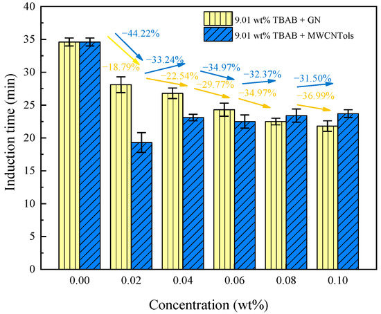 The induction time of hydrate formation in the 9.01 wt% TBAB solution with different concentrations of MWCNTol and GN systems.