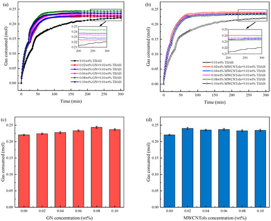 Figure 4 shows the gas (CO2) consumption of hydrate formation in 9.01 wt% TBAB mixed with different concentrations of MWCNTol and GN systems, and their final gas consumptions are displayed in Table 1. From Figure 4a,b, it can be seen that for all cases, two stages of hydrate formation were observed. This result was consistent with the result reported in the previous literature [53]. In the literature, it can be found that there were two stages for hydrate formation in the presence of TBAB: (1) pure TBAB hydrate formation; and (2) gas molecules entered the empty cages of TBAB hydrate to form TBAB-CO2 binary hydrate. This may raise the question of why the pure TBAB hydrate formation did not result in a large amount of gas consumption, while more than 0.1 mol of gas consumption was observed in the first stage, as shown in Figure 4a,b. It should be noted that these two stages could not be strictly distinguished in practice. Simultaneously, in the initial stage of the experiment, a large amount of CO2 gas could also be dissolved in water. Therefore, a considerable amount of CO2 gas consumption was found in the initial stage of these experiments. Furthermore, Figure 4 shows that the gas consumption in the 9.01 wt% TBAB + GN and 9.01 wt% TBAB + MWCNTol systems was almost maintained at the same level. It is clearly shown in Table 1 that the final gas consumption in 9.01 wt% TBAB + MWCNTol and 9.01 wt% TBAB + GN systems was similar, although some slight differences were found for different nanoparticle concentrations.