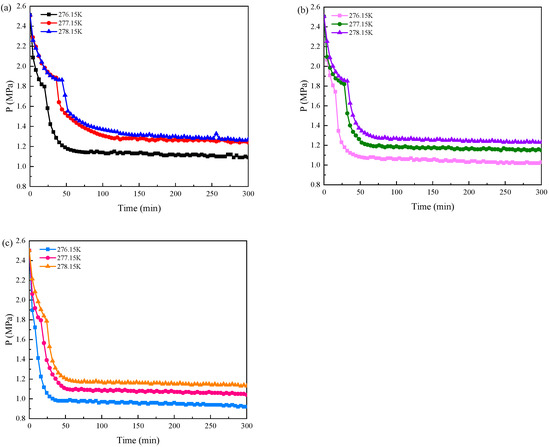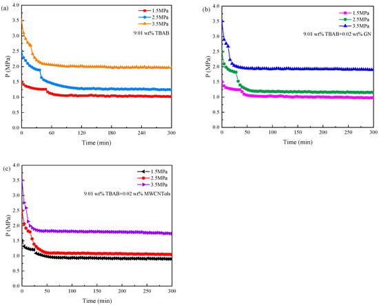 The difference between the experimental initial conditions and the equilibrium conditions is the driving force of hydrate formation according to Englezos et al. [54]. Therefore, the initial pressure and experimental temperature are two important parameters that affect the hydrate formation. Figure 5 shows the pressure changes of the three additive systems in the reactor during the CO2 hydrate formation at different initial pressures when the initial temperature was 277.15 K. The hydrate formation process was exothermic. When the temperature in the reactor suddenly jumped, it could be considered that a large amount of hydrate began to form, and the pressure in the reactor decreased rapidly. As can be seen in Figure 5, the drop in pressure for the hydrate formation in the three additive systems to reach the equilibrium state was increased with the increase in the initial pressure. When the initial pressure was increased from 1.5 MPa to 3.5 MPa, the drop in pressure in 9.01 wt% TBAB, 9.01 wt% TBAB + 0.02 wt% GN, and 9.01 wt% TBAB + 0.02 wt% MWCNTol systems was 0.45–1.49 MPa, 0.48–1.56 MPa, and 0.56–1.68 MPa, respectively. It can be seen that the higher the initial pressure, the faster the pressure drop rate.