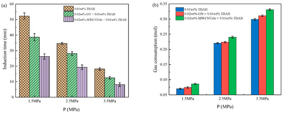 The changes in induction time and final gas consumption in the three additive systems are shown in Figure 6a,b, and the experimental data are shown in Table 2. It can be seen that with the increase in initial pressure, the hydration driving force was increased, the induction time was shortened, and the final gas consumption was increased. As the initial pressure increased from 1.5 MPa to 3.5 MPa, the induction time of the TBAB single system was decreased by 65.20% and the final gas consumption was increased by 326.68%. The induction time of TBAB + MWCNTol and TBAB + GN systems was reduced by 69.08% and 67.70%, respectively, and the final gas consumption of their systems was increased by 284.11% and 317.45%, respectively. Different initial pressures would provide different driving forces. At higher initial pressures, the dissolution rate of CO2 increased significantly, thereby promoting the hydrate nucleation and shortening the induction time in hydrate formation. However, the higher the pressure, the more the hydrate formation. In the experiment conducted by Zhou et al. [16], when the pressure was 4.5 MPa, the temperature was 277.15 K and the stirring rate was 300 rpm. Although the induction time was significantly shortened, the gas consumption was not increased. This may be because a large number of hydrates had already been formed in the early stage, and the gas–liquid contact area would rapidly form the hydrate films, thereby obstructing the further mass transfer of the gas, resulting in an insignificant increase in gas consumption, which may be also caused by the stirring rate. At the same time, increasing the pressure to speed up the hydrate formation had a limit, because carbon dioxide may be liquefied with the increasing pressure, and the phase transition of gas would affect the process of hydrate formation in the system.