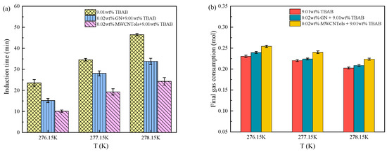 The changes in induction time and final gas consumption in the three additive systems are shown in Figure 8a,b. The experimental data are shown in Table 2. It can be seen that the induction time of different additive systems was decreased and the final gas consumption was increased with the decreased experimental temperature. This was mainly because the lower the ambient temperature, the smaller the hydrate phase equilibrium pressure. When the initial pressure was constant, the lower the experimental temperature, the greater the driving force of hydrate formation, which is more conducive to the hydrate formation. With the experimental temperature dropping from 278.15 K to 276.15 K, the induction time of the TBAB single system was decreased by 49.25% and the final gas consumption was increased by 13.78%. The induction time of the TBAB + MWCNTol system was decreased by 58.44% and the final gas consumption was increased by 13.68%, and the induction time of the TBAB + GN system was reduced by 55.03% and the final gas consumption was increased by 14.81%. When the initial pressure and the additive concentration were the same, the lower the experimental temperature, the lower the hydrate formation pressure, and the more it could promote the hydrate formation. Meanwhile, the process of hydrate formation was a constant heat release, and the continuous accumulation of heat would cause the temperature to increase and then inhibit the hydrate formation process. A lower experimental temperature is more conducive to the timely removal of heat, thereby promoting hydrate formation [55]. At lower temperatures, the dissolved amount of CO2 would also increase, and the heat transfer was a key factor affecting the CO2 hydrate formation. The effect of experimental temperature on induction time was more obvious than that on the final gas consumption during hydrate formation. It also could be seen that by taking induction time and final gas consumption as evaluation criteria, the influence of initial pressure on the CO2 hydrate formation was greater than that of the experimental temperature. The induction time of 9.01 wt% TBAB + 0.02 wt% MWCNTols at 3.5 MPa and 277.15 K was the shortest compared to that of different pressures (1.5 and 2.5 MPa), i.e., 8.1 ± 1.2 min. The gas consumption was also the highest among them, i.e., 0.3311 ± 0.0026 mol. Similarly, reducing the experimental temperature could also improve the kinetics of CO2 hydrate formation at 2.5 MPa. The induction time of 9.01 wt% TBAB + 0.02 wt% MWCNTols at 2.5 MPa and 276.15 K was shorter than that at different temperatures (277.15 and 278.15 K), i.e., 0.2543 ± 0.0026 mol. Therefore, to better shorten the induction time and increase the gas consumption in hydrate formation in practical applications, we could reduce the experimental temperature or increase the pressure to achieve the target requirements.