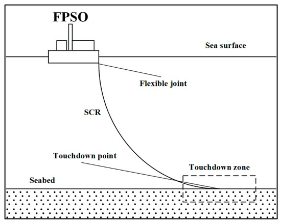 A flexible riser such as a steel catenary riser (SCR) is frequently encountered in deepwater production systems, including as a connection between the floating production storage and offloading (FPSO) system and the production lines [1]. The SCR is joined via a sag bend section to a flow line that is placed on the seabed, and the touchdown point is the boundary between it and the SCR [2], as shown in Figure 1. The heave–pitch motions of the floating platform and the random motion of the waves can cause alternating movements of contact and separation between the touchdown zone (TDZ) of the riser and the seabed. This reciprocating motion often generates a large bending stress on the TDZ, leading to a high risk of fatigue damage [3,4]. Pigging of the SCR, especially the TDZ, in such conditions will increase the risk of riser failure and becomes a very tricky problem.