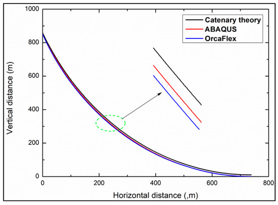 The general form of the steel catenary riser was first calculated in a quasi-static manner using the catenary theory, ABAQUS, and OrcaFlex (https://www.orcina.com/orcaflex/) to preliminarily check this model. In ABAQUS, a vertical upward displacement load was applied to the top of SCR until it reached a height of 850 m, and then it was hinged to form a catenary shape. In OrcaFlex, the catenary shape of the riser was obtained by setting the distance between the two ends of the riser in the horizontal and vertical directions and applying a hinged boundary condition to both ends of the riser. The results are shown in Figure 3.