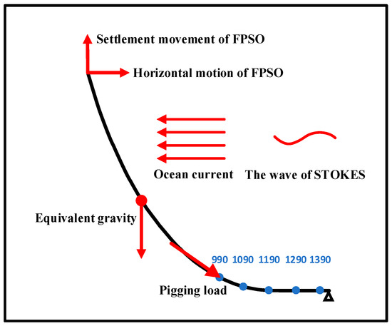 The stress and displacement of the steel catenary riser is affected by the pigging load, ocean currents, waves, gravity, FPSO system motion, and the riser’s own gravity and buoyancy. The force applied on the steel catenary riser is shown in Figure 4. The characteristics of the ocean current are as follows: the distance between the hinged point and seabed is 862 m, the acceleration of gravity is 9.8 m/s2, and the density of the fluid is 1021 kg/m3. The velocity of the ocean current is 0.3 m/s at 300 m above the seabed, 0.68 m/s at 600 m above the seabed, and 0.98 m/s at 862 m above the seabed. The wave is a Stokes wave. The wave amplitude is 1.2 m with a period of 8 s. The wave phase angle is 54.03° and the propagation direction is horizontally to the left. The settling motion and horizontal motion of the FPSO system are replaced by a sine function with an amplitude of 1.2 m and period of 8 s.