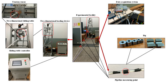 In order to verify the simulation results, a truncated and scaled-down experimental model of an SCR under pigging conditions was designed, as shown in Figure 6. This experimental rig consisted of an aluminum space frame (for modeling the pigging load), nylon tube (for modeling the SCR), two-dimensional motion control slide (for modeling the movement of the TDZ), fiber optic measurement system (for stress measurements), high-speed camera system (for displacement measurements), and data acquisition system. In order to assess the real motion of the TDZ in the experiment, the motions of node 990 were extracted from ABAQUS and entered into the two-dimensional motion control system to simulate its movement. Considering the experimental environment and the possibility for the acquisition of experimental materials, an experimental model was truncated first and then scaled down, and the scaling ratio selected in this experiment was 24.1 according to the calculation.