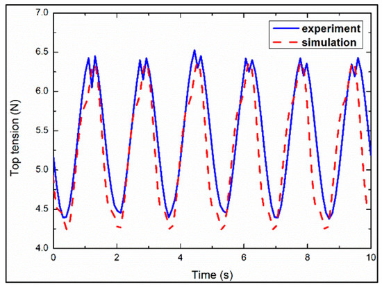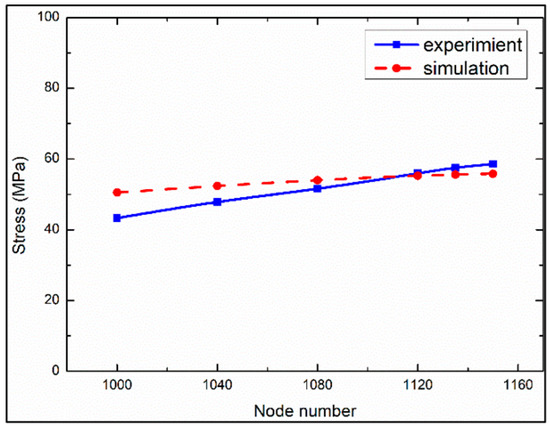 The top tension data from the experiment were compared with the simulation data, as shown in Figure 7. It can be found that the experimental and simulation data agree with each other and are consistent with the sinusoidal motion law. Figure 8 shows the maximal von Mises stress values of six nodes along the SCR under pigging conditions obtained by the FBG (fiber Bragg grating) strain sensor. Compared with the experimental results, the numerical simulation results have a maximum error of 16.6% but a minimum error of 1.2%, which is acceptable at this stage.