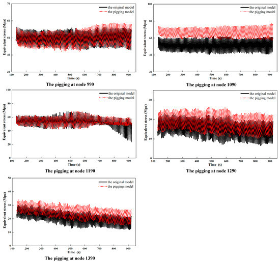 The pigging process in a steel catenary riser is a dynamic and continuous process, and it is difficult to evaluate the pigging velocity at different positions. To solve this problem, it was assumed that the pig would stay in a certain position on the riser for a relatively long time (100 cycles of waves and FPSO motions) in the simulation to explore the extreme cases of equivalent stress changes at this point during the pigging process. The direction of the pig impact load is along the tangential direction of the riser node where the pig is located. In the simulation of steel catenary riser pigging, the top of the riser needs to be lifted to a predetermined position within 0–120 s. After the riser reaches the predetermined position, the above boundary conditions and loads are applied to simulate the riser pigging state, and the calculation time range is 120–1920 s. From 120 s to 920 s, the pig with different initial velocity rates and a mass of 80 kg passes through 5 nodes (nodes 990, 1090, 1190, 1290, and 1390) of the touchdown zone of the riser to study the stress and displacement variations in these nodes. Figure 9 shows a comparison of the equivalent stress variations of five research nodes in the TDZ of the riser with and without the impact load of the pig. The black solid line represents the equivalent stress variation without considering the pigging impact load, i.e., the original model, and the red dotted line represents the riser model of the equivalent stress variation considering the pigging impact load, i.e., the pigging model. It can be seen from Figure 6 that the equivalent stress values of different nodes in the riser TDZ increased certainly due to the pigging impact load. The closer to the touchdown point, the more obvious this trend is, and a 49.3% maximum stress increase can be found at node 1090. However, the periodic variation law of the equivalent stress due to the waves and FPSO motion is not affected by the pigging impact load.