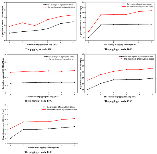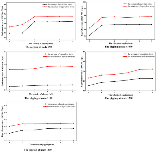 In order to further investigate the variations in the equivalent stress values of the node in the effects of different pigging impact loads (different pigging velocity), the equivalent stress was extracted, as shown in Figure 10. It can be found that the pigging impact load has a larger effect on the left part of the touchdown point (nodes 990 and 1090) compared with the right part (nodes 1290 and 1390) at the 1 m/s and 2 m/s pigging velocity rates. Here, a 30.5% maximum increase occurs due to the pigging impact load on nodes 990 and 1090. However, a small increase can be found when the pigging velocity increased from 2 m/s to 5 m/s, due to the touchdown point shifting to the left. Nodes 990 and 1090 gain support from the seabed. For the right part of the touchdown point, a slight increase in the riser stress occurs with the increase in the pigging impact load.