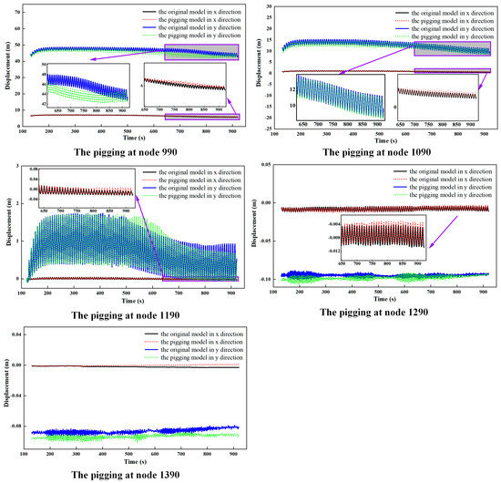 There are initial displacements at different nodes during the lifting of the SCR from horizontal riser to the catenary riser (0–120 s in the simulation). After applying the pigging impact load, the SCR will shift further based on the initial displacement. In order to study the displacement variations in the SCR riser’s TDZ under the coupling action of wave currents, a floating production platform, and the pigging impact load, the displacements of five nodes (nodes 990, 1090, 1190, 1290, and 1390) in the touchdown zone were investigated and the absolute displacements of these nodes were extracted, as shown in Figure 11. The black solid line represents the absolute displacement resulting from the original model (without the pigging impact load) in the X direction (the X/Y axis is shown in the upper left corner of Figure 5) and the red dotted line is the absolute displacement in the X direction from the pigging model. The blue solid line and the green dotted line represent the absolute displacements in the Y direction resulting from the original model and the pigging model, respectively.