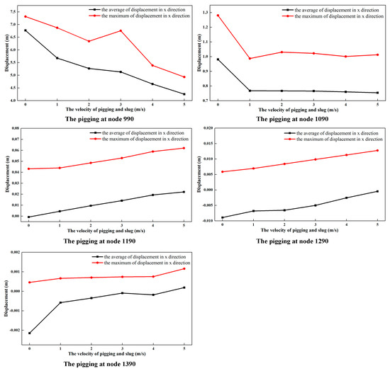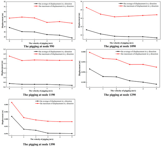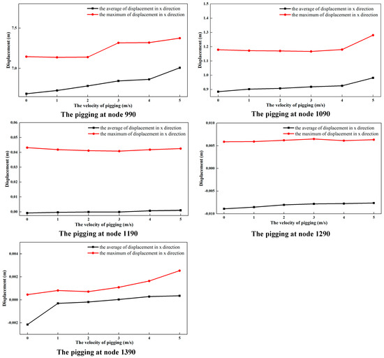 The variations in displacement at different nodes of the TDZ with different pigging velocity values were further studied, and the displacements in the X and Y direction were extracted and are shown in Figure 18 and Figure 19. It can be found in Figure 18 that with the increase in pigging velocity, the average and maximum displacements of the nodes on the left of the TDP in the X direction decrease monotonously, which means that with the effects of multiple loads, these nodes experience an offset to the left (as for the X and Y directions shown in Figure 5). On the contrary, the nodes on the right of the TDP undergo an offset to the right, and the offset increases with the increment in the pigging velocity.