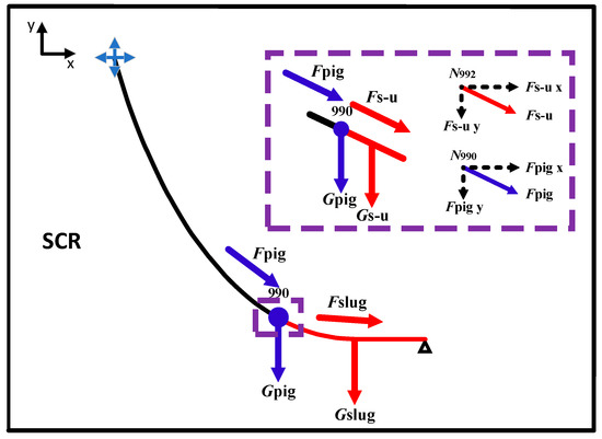 The pigging-induced slug load is applied on the riser in the same way as the pigging impact load. Figure 14 shows a schematic diagram of the impact of the pig and the slug loads on the riser when the pig runs to the 990 m position of the riser. Among them, Gpig represents the gravity load of the pig itself; Fpig represents the impact load of the pig on the pipeline, which can be decomposed into concentrated loads along the X and Y directions; Gslug represents the gravity load of the slug flow in front of the pig; Fslug represents the impact load of the slug flow in front of the pig. In order to ensure the computational efficiency of the model, the direction of the impact load resulting from the slug on the riser is approximately the same for every 2 m; that is, the slug load every 2 m is a computational unit. Here, Fslug-unit represents the slug load of the above calculation unit (represented by Fs-u in Figure 14). Similarly, Fs-u can be decomposed into concentrated loads in the X and Y directions.