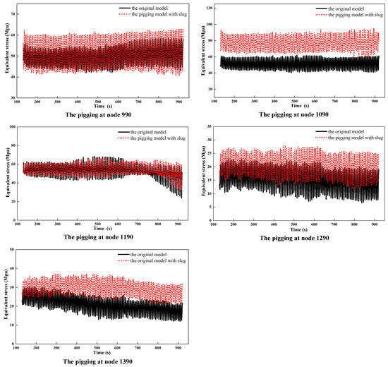 In order to further study the influence of the slug load in front of the pig on the stress variation of the SCR during the pigging process, a pig with initial velocity of 1 m/s and mass of 80 kg passing through five nodes (nodes 990, 1090, 1190, 1290, and 1390) was investigated. The slug load was applied on the section between the corresponding research node and the riser end at the same time (with slug lengths of 410 m, 310 m, 210 m, 110 m, and 10 m, respectively), and the initial velocity of the slug was the same as the pig (1 m/s). The pigging loads are compared to the slugging loads applied on the riser in Table 4. The equivalent stress values of different nodes of the riser were extracted and are shown in Figure 15. The black solid line represents the riser model without considering the pigging load, i.e., the original model, and the red dotted line represents the riser model considering slug flow and pig impact load, i.e., the pigging model.