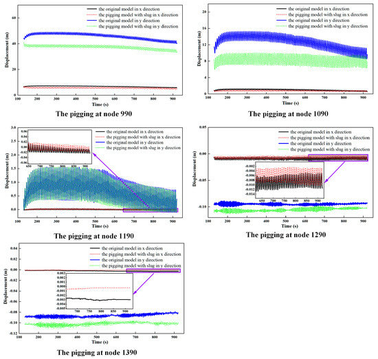 Th analysis in Figure 17 indicates that compared with the original model, the nodes on the left side of the TDP of the pig model considering the slug load show a left offset trend in the X direction, while the nodes on the right side show a right offset trend due to the superposition of the slug load, which is different from the trend for the effect of only the pigging impact load. A large offset in the Y direction for nodes on the left side of the TDP can be observed (nodes 990 and 1090). A 10.05 m maximum offset in the Y direction occurred at node 990. However, this trend is not obvious for nodes 1290 and 1390 due to the seabed support.