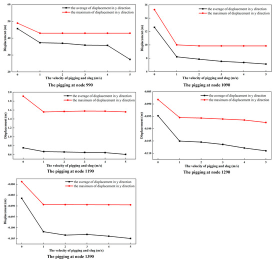 Figure 19 shows that with the increase in velocity of the pig and slug flow, the average displacement of the five nodes in the Y direction decreases monotonously, and the maximum displacement decreases as well, indicating that the velocity of the pig and slug flow is positively correlated with the downward offset of the nodes around the TDZ in the Y direction. With the increase in velocity of the pig and slug flow, the displacement offset of the nodes on the left of the TDP becomes significantly greater than that of the nodes on the right. Here, a 2.51 m absolute displacement in the X direction and a 18.29 m absolute displacement in the Y direction occurred at node 990, when the pigging velocity increased from 0 m/s to 5 m/s.
