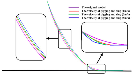 Figure 20 was obtained by extracting the shape of the riser from ABAQUS, revealing the shape of SCR at different pigging velocities when the pig is located at node 990 and when the slug flow is considered. It can be found that when the slug flow is considered, the node near the left of the SCR TDP moves downward due to the pigging load. However, the nodes far away from the SCR TDP move upward due to the deformation of the steel catenary riser. The larger the pigging velocity, the more serious the deformation of the SCR. Fortunately, even a heavy pig moving at 5 m/s stops within 0.1 s and cannot destroy the riser.