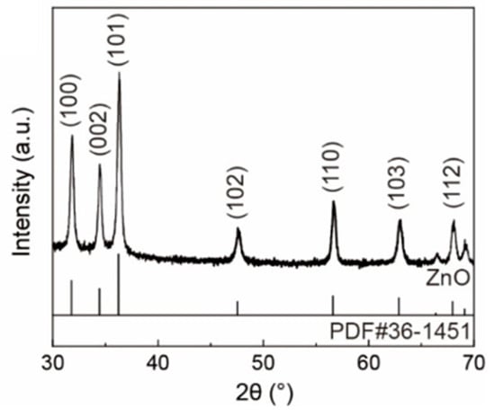 The microstructure of the sample was analyzed, and the XRD patterns of pure ZnO are shown in Figure 2. The XRD pattern of ZnO contained the diffraction peaks at 2θ = 31.86°, 34.56°, 36.36°, 47.64°, 56.66°, 62.92°, 66.54°, 67.99°, and 69.16°, which are assigned to the reflection lines of (1 0 0), (0 0 2), (1 0 1), (1 0 2), (1 1 0), (1 0 3), (2 0 0), (1 1 2), and (2 0 1) showing a hexagonal wurtzite structure (PDF#36-1451). No other discernible diffraction peaks were detected, indicating the high purity of the ZnO sample. The sharp and intense diffraction peaks further validate the high crystallinity of the ZnO nanofiber film.