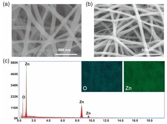 The micromorphology and composition of the ZnO nanofiber film were analyzed by SEM. The SEM images of the polymer film and ZnO nanofiber film are shown in Figure 3a,b, respectively. The polymer film is composed of a large number of nanowires, with a smooth surface and an average diameter of about 97.7 nm. In contrast, the surface of the ZnO nanofiber film is rough, with an average diameter of about 59.09 nm; this phenomenon is consistent with previous reports [18,19]. ZnO nanofiber film nanowires were found to be finer and rougher compared to those in the polymer film. The main reason can be attributed to the degradation temperature of PVP in polymer film being about 343–361 °C [18,19]. During the roasting process at 600 °C, PVP was degraded to generate gases such as CO2, H2O, et al. The volatilization of these gases and the degradation of PVP lead to increased surface roughness. The rough surface of ZnO nanofiber film has a larger specific surface area to provide a more active site, which is advantageous for improved gas sensing, particularly when the diameter of the nanowire is the same. The EDS spectrum of the ZnO nanofiber film is shown in Figure 3c. From the spectrum, it can be seen that the Zn and O elements are uniform, with no diffraction peaks of other elements, indicating the complete degradation of PVP.