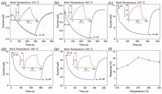 The H2-sensing performance of the ZnO nanofiber film was tested, as shown in Figure 4. The H2 concentration used in the test was 20 ppm, and the applied voltage was 10 V. The current variation curves (a–e) represent the response of the ZnO nanofiber film, and the insets depict the corresponding dynamic response curves to H2. It is obvious that the baseline current of the ZnO nanofiber film exhibits an increasing trend as the temperature increases; the main reason is the increase in carrier concentration caused by thermal excitation. The response of the film to H2 initially increases and then decreases, reaching its maximum value at 270 °C with a response of approximately 28.84%. At lower operating temperatures, the activation energy on the surface of the gas-sensitive material is relatively low, resulting in a lower response from the sensor. However, when the temperature exceeds the optimal temperature, the desorption rate on the surface of the gas-sensitive material surpasses the adsorption rate, leading to a decreased sensor response [7,20].