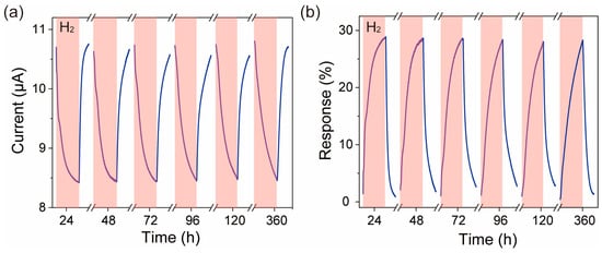 Repeatability is an important indicator for evaluating sensor performance. To test the long-term stability of the ZnO nanofiber film sensor, we stored the ZnO nanofiber film H2 sensor in a Petri dish and placed it in a cabinet. The long-time repeatability of the ZnO nanofiber film towards 20 ppm H2 was tested at the optimal operating temperature of 270 °C as shown in Figure 5. From Figure 5a, we found that the current of the ZnO nanofiber film decreased with the introduction of H2 during multiple testing processes. After 5 min of H2 was introduced, the current of the ZnO nanofiber film was about 8.42 μA when placed for 24 h, ~8.43 μA at 48 h, ~8.44 μA at 72 h, ~8.45 μA at 96 h, ~8.48 μA at 120 h, and ~8.46 μA at 360 h. Multiple test results consistently exhibited anomalous behavior, confirming that the anomalous phenomenon is not random. The calculated sensitivity curve is shown in Figure 5b, where it can be seen that the sensitivity of the ZnO nanofiber film sensor is about 28.89% when placed for 24 h, ~28.66% at 48 h, ~28.62% at 72 h, ~28.40% at 96 h, ~28.04% at 120 h, and ~28.31% at 360 h. The range between the maximum and minimum sensitivity values during this period, the average value of multiple tests, and the maximum error rate are 0.85%, 28.49%, and 1.6%, respectively, indicating that there is no significant degradation in the sensitivity of the ZnO nanofiber film to 20 ppm H2. This indicates that the ZnO nanofiber film exhibits good stability.