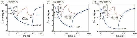 The response of the ZnO nanofiber film to different concentrations of H2 is shown in Figure 6, where the current of the ZnO nanofiber film decreasing with the introduction of H2 concentration at 30 ppm, 50 ppm, and 100 ppm is shown in Figure 6a–c, respectively. The calculated sensitivity curve is shown in the inset of Figure 6a–c, where it can be seen that the sensitivity of the ZnO nanofiber film sensor is about 35% at 30 ppm H2, ~59% at 50 ppm H2, and ~120% at 100 ppm H2, and when the H2 concentration increases in the range of 20 ppm–100 ppm, the ZnO nanofiber film’s gas-sensing response enlarges. This phenomenon proves that the anomaly is not random.