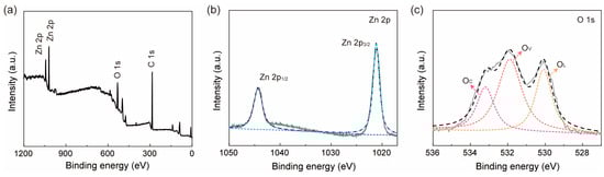 Investigating this abnormal phenomenon that a decreased response current was observed in the ZnO nanofiber film is of great significance for us to understand the H2 sensing mechanism of ZnO. Through XPS analysis, two elements of Zn and O in the sample were found, as shown in Figure 7a. No impurities were discovered, indicating a high degree of purity. The C 1s peak at 284.8 eV was used for calibration. As shown in Figure 7b, the Zn element exists in the valence state of about 2+. The O 1s peak was deconvoluted into three different components: lattice oxygen (OL) at approximately 530.1 eV, oxygen vacancy (OV) at around 531.9 eV, and chemically adsorbed oxygen (OC) near 533.2 eV. It can be seen from Figure 7c that the proportion of OC, OV, and OL is about 31.06%, 36.52%, and 32.42%, respectively. High oxygen vacancy content is beneficial for the adsorption of gas molecules. Oddly, the binding energy of OV and OC is obviously higher than the standard values of OV (531.1 eV) and OC (532.2 eV), while the binding energy of OL is almost the same as the standard value of OL (530.09 eV) [21].