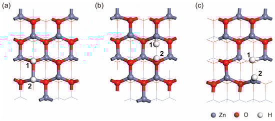 Here, the Milligan charge analysis method was used to calculate the charge transfer during the adsorption of H2 on the ZnO surface. Two distinct configurations were identified by analyzing the charge transfer [32,33,34], and those configurations are illustrated in Figure 8a,b. In Figure 8a, the charge transfer for H1 and H2 is determined to be 0.44 e (electron) and −0.28 e, respectively. In Figure 8b, the charge transfer for H1 and H2 is found to be −0.34 e and 0.44 e, respectively. We find that H atoms that adsorb on Zn atoms gain electrons, resulting in the generation of H−, while they adsorb on O atoms and lead to the generation of H+ through electron loss. Considering the preparation method employed in this study, which results in a significant presence of OV, the adsorption of H2 at OV sites was also investigated, as depicted in Figure 8c [35]. The calculated charge transfer between H atoms and ZnO reveals that the charge transfer for H1 and H2 is −0.39 e and −0.26 e, respectively. These results indicate that the chemical adsorption of H2 at the OV sites on the ZnO surface involves electron gain, which will lead to a reduction in the carrier concentration in the ZnO system. This reduction macroscopically manifests as a decrease in current. The DFT calculations provide further validation of the experimental observations reported in this study.
