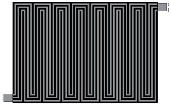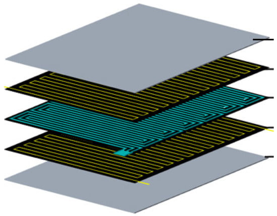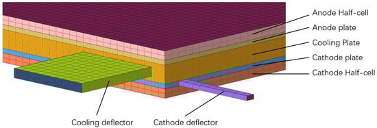 The PEMFC stack exhibits a symmetrical structure on the packaging, consisting of a membrane electrode (MEA) and a bipolar plate. The membrane electrode consists of a proton exchange membrane, a cathode catalytic layer, and a cathode gas diffusion layer. Therefore, this model adopts a symmetrical structure. As shown in Figure 1, from top to bottom are half-membrane electrodes, bipolar plates with gas and cooling channels, and half-membrane electrodes, respectively. Moreover, the cooling channel structure is shown in Figure 2, and the basic parameters of the battery are shown in Table 1.