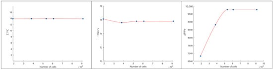 Figure 4 represents the mesh independence verification. It demonstrates the relationship between the cooling channel inlet–outlet temperature difference, pressure drop, and maximum temperature of the cooling plate with varying mesh numbers, indicating the simulation’s dependence on mesh refinement. From the figure, it can be observed that, except for the pressure drop at the cooling channel inlet–outlet, the other parameters remain relatively constant. Once the mesh number exceeds 532,640, the pressure drop no longer changes significantly. Therefore, this study employs a mesh partitioning approach with a total of 532,640 grid cells.