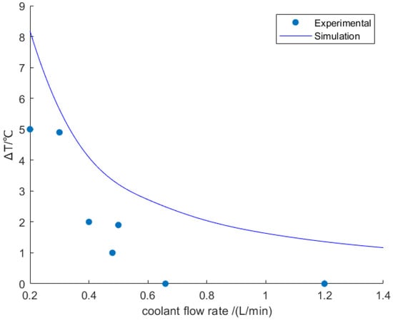 Comparison of the temperature difference between the coolant outlet and inlet for different coolant flow rates with experimental results.