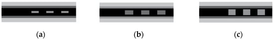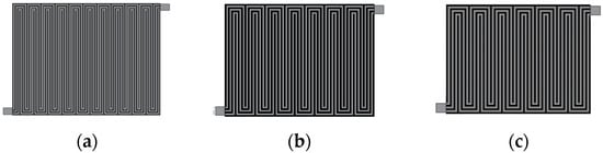 The optimized flow channel structure can effectively improve the heat transfer capacity of the cooling water, thereby enhancing the heat dissipation capacity of the stack []. In order to investigate the effect of channel ridge width on battery cooling efficiency, three forms of cooling channels were designed in this study. The ridge widths of the cooling channel are 0.5 mm, 1.5 mm, and 2 mm, respectively, the cross-section of the channel is 2 × 1 mm2, and the single battery area is 158 × 120 mm2. Figure 6 shows the geometric structure of the three cooling channels.