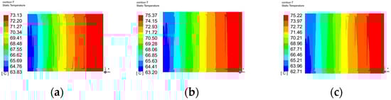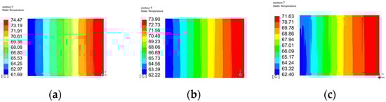 Figure 7 shows the temperature distribution contour plots of the fuel cell at a heat source heat flux density of 3 × 106 W/m3. The temperature distribution of the fuel cell is similar for all three structures. From the perspective of the lowest temperature, the lowest temperature of the fuel cell increases with the increase in ridge width. From the contour plots, it can be observed that after the cooling water enters the channels, it absorbs a significant amount of heat, causing a rapid decrease in the fuel cell temperature. As the cooling water flows, its heat transfer capacity gradually decreases, absorbing less heat, and, consequently, the rate of temperature reduction of the fuel cell slows down.