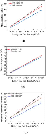 Temperature variation of battery with different channel ridge widths as a function of heat flux density. (a) Maximum battery temperature–heat flow density. (b) Average cell temperature–heat flow density. (c) Maximum cell temperature difference–heat flow density.