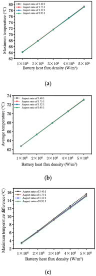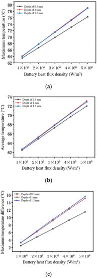 Temperature variation of battery with different channel depths as a function of heat flux density. (a) Maximum battery temperature–heat flow density. (b) Average cell temperature–heat flow density. (c) Maximum cell temperature difference–heat flow density.