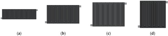 In addition to the direct influence of the cooling channel structure on the fuel cell temperature distribution, the fuel cell itself may also impact the cooling effectiveness. To further explore the factors influencing the cooling effectiveness of the fuel cell, this section focuses on the study of the fuel cell’s dimensions. While maintaining a consistent cell area of 158 × 120 mm2, we conducted a comparative study by varying the aspect ratio of the fuel cell to analyze its impact on the temperature distribution. We designed four different fuel cell structures with aspect ratios of 3.40:1, 1.75:1, 1.32:1, and 0.95:1. The cooling channel structures for all four configurations have a channel spacing of 2 mm and a channel depth of 1 mm. Figure 12 illustrates the structures of the four cooling channels.