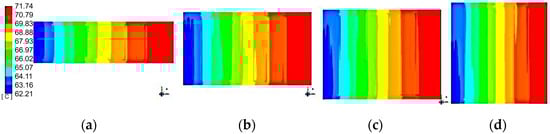 Temperature distribution of batteries with different stack length–width ratios: (a) aspect ratio of 3.40:1, (b) aspect ratio of 1.75:1, (c) aspect ratio of 1.32:1, and (d) aspect ratio of 0.95:1.