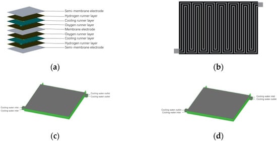Double layer PEMFC model setup. (a) Double-layer PEMFC structure. (b) Cooling runner structure diagram. (c) Cooling water flows in the same direction. (d) Cooling water reverse flow.