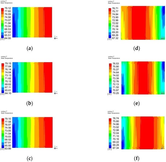 Figure 10 shows the temperature distribution contour plots for different cell structures with a heat source of 4 × 106 W/m3. The temperature distribution in the contour plots is similar, and the cell temperature gradually increases with the flow direction of the cooling water. From the perspective of the lowest temperature, the cells with a channel depth of 0.5 mm, 1 mm, and 1.5 mm have the lowest temperatures of 63.8 °C, 63.2 °C, and 62.7 °C, respectively. Moreover, the lowest temperature decreases as the channel depth increases.