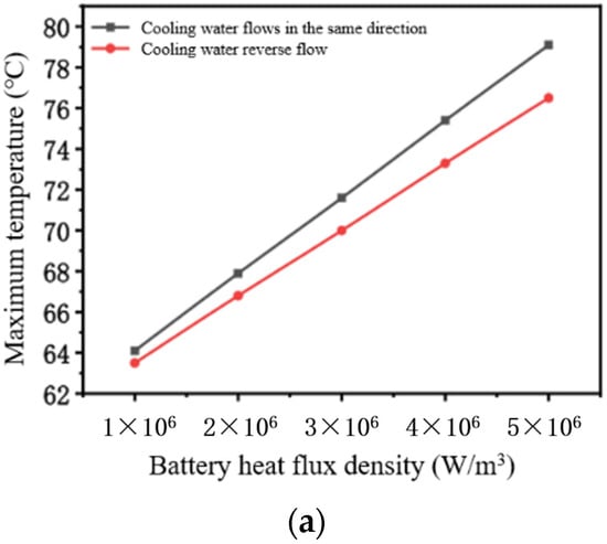 However, when the cooling water flows in the opposite direction, the temperature distribution of each cell varies significantly due to the inconsistency in the cooling water flow direction. Specifically, the upper half of the fuel cell is more affected by the upper cooling water, resulting in lower temperatures at the inlet and higher temperatures at the outlet of the upper half of the cell. On the other hand, the temperature distribution of the lower half of the fuel cell is opposite to that of the upper half. The middle cell is located between the two layers of cooling water, resulting in a symmetrical temperature distribution, with lower temperatures on both sides and higher temperatures in the middle. Figure 17 shows the temperature variation plots of the fuel cell with cooling water flowing in the same and opposite directions. From Figure 14a, at the same heat flux density, the maximum temperature is higher with cooling water flowing in the same direction compared to the opposite direction. As the heat source heat flux density increases from 1 × 106 W/m3 to 5 × 106 W/m3, the maximum temperature of the fuel cell with cooling water flowing in the same direction increases from 64.1 °C to 79.1 °C, while the maximum temperature of the fuel cell with cooling water flowing in the opposite direction increases from 63.5 °C to 76.5 °C, resulting in a difference of 2.6 °C between the two, which is higher compared to the 0.6 °C difference observed at lower heat flux density. However, the average temperature of the fuel cell is lower when the cooling water flows in the same direction. Additionally, at a lower heat flux density, the average temperature of the fuel cells is almost the same for both flow directions. However, at a higher heat flux density, the average temperature of the fuel cell with cooling water flowing in the opposite direction is significantly higher than that with cooling water flowing in the same direction. Furthermore, the maximum temperature difference is lower with cooling water flowing in the opposite direction, and the temperature distribution of the fuel cell is more uniform. As the heat flux density increases from 1 × 106 W/m3 to 5 × 106 W/m3, the maximum temperature difference of the fuel cell with cooling water flowing in the opposite direction increases from 2 °C to 7 °C.