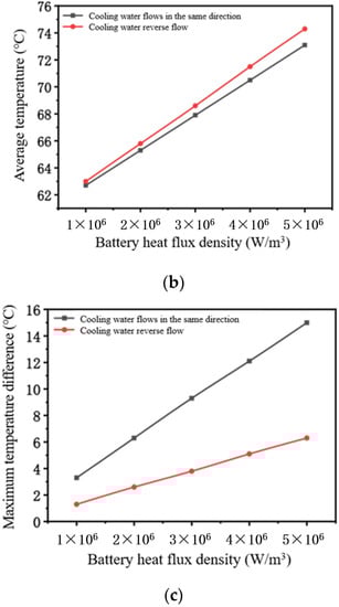 Temperature variation of different cooling water flows towards the battery with heat flux density. (a) Maximum battery temperature–heat flow density. (b) Average cell temperature–heat flow density. (c) Maximum cell temperature difference–heat flow density.