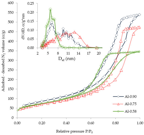 The pore volume of the applied supports varied from 0.58 cc/g to 0.90 cc/g. From the presented data, it can be observed that the sample of the Al-0.75 support was characterized by pores with the largest effective diameter as well as the largest volume of pores with an effective diameter of more than 7 nm. The deposition of oxide precursors on the support led to a decrease in the specific surface area and pore volume by 31–33%. This is consistent with the amount of deposited components and thus indicates that excessive coking of the pores did not occur during sulfidation.
