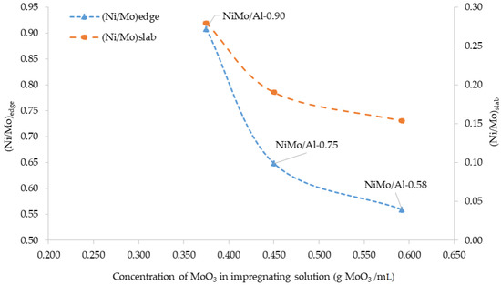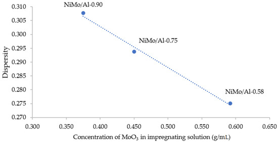 The degree of promotion of crystallites of the active phase and their edges decreased from 0.28 to 0.15 and from 0.91 to 0.56, respectively, with an increase in the concentration of MoO3 in the impregnating solution. The graphical representation of this dependence is shown in Figure 5.