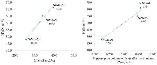 The aromatics hydrogenation rate ranged from 48.2% for NiMo/Al-0.58 to 71.3% for NiMo/Al-0.75. The sample NiMo/Al-0.75 also demonstrated the highest specific aromatics hydrogenation rate of 2.31%/mmol Mo. The variation in the specific aromatics hydrogenation rate correlates with the content of the NiMoS phase, as shown in Figure 6. The described variations in the active phase morphology and composition lead to the presence of an observable dependence between HYD activity and the support volume of pores with a diameter larger than 7 nm, as also shown in Figure 6.
