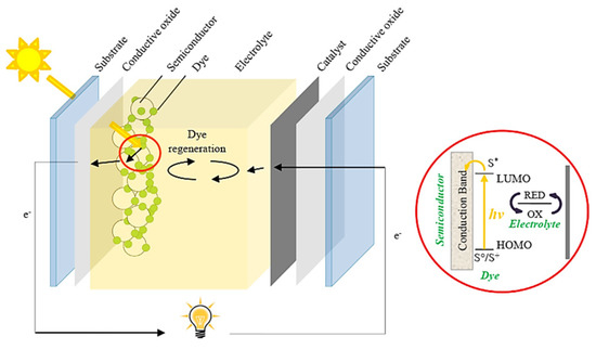 The first step to maximizing the sunlight harvesting in low-cost PV devices was introduced by Grätzel in 1991 [25], to fabricate dye-sensitized solar cells (DSSCs) by using natural/synthetic organic materials. These molecules favored carrier generation and transport, obtaining an initial PCE of 10%. As shown in Figure 1 [26], DSSCs are based on the deposition of ruthenium (II) polypyridyl complex monolayers on TiO2 films acting as working electrodes (photoanodes). Meanwhile, platinum-transparent glass is used as a counter electrode (also called a cathode), being coupled with the active layer to achieve the expected device. The operational performance of the DSSCs to produce electricity depends on the efficiency of exciton formation. In this scenario, the photogenerated electrons coming from the highest occupied molecular orbital (HOMO) of the organic complex (hereafter named sensitizer) are accumulated in the lowest unoccupied molecular orbital (LUMO), and then transferred to the conduction band (CB) of the TiO2 layer. Then, these carriers are transported to the external circuit of the PV cell to reach the cathode, generating photocurrent. The electron depletion in the HOMO of the dye is filled by electrons from the electrolyte, which is composed of a redox system based on the I−/I3− pair. Lastly, iodide is regenerated by reducing the triiodide species through electrons collected by the cathode, closing the circuit where the current is produced. This contribution opened the door to new organic photomaterials based on dyes, polymers, and small molecules with suitable electronic properties, giving the possibility to fabricate organic solar cells [27,28,29]. Although the selective contacts (electron and hole transporter layers, ETL and HTL, respectively) impact carrier generation and transport into the PV device, organic molecules exhibit limited light harvesting in a wide range of the energy spectrum and restrained exciton diffusion [30]. These features favor a decrease in carrier density to be transported into the solar cells, hampering their operational performance.